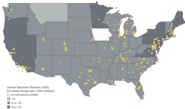 首先是需求端。如图所示,如果我们审视全美自闭症谱系障碍(ASD)的患病率地图,会发现不同地区的颜色深浅不一,代表了需求的差异。黄色的点位标记出了患病率的具体分布情况,这些地区对于康复服务的需求是刚性且迫切的。